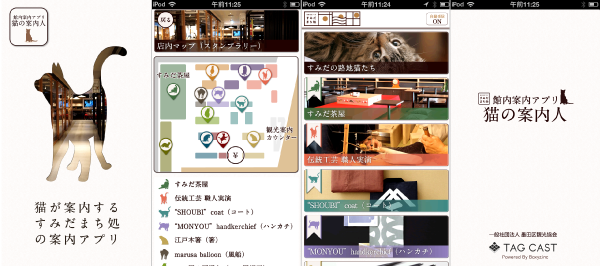 「すみだまち処」のO2O館内案内アプリです。館内を「すみだの街」に見立てて、iPhoneを使ったバーチャルな街歩きを体験できます。道案内をしてくれるのは、すみだの路地猫をイメージしたキャラクターです。館内のお勧め商品の場所を可愛い鳴き声で知らせる他、説明文、動画を再生します。また、商品の場所を廻った際、館内マップ画面に猫のスタンプが押されます。