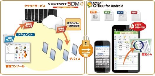 今回ご提供する「KINGSOFT Office for Android SDM ver.」は、「VECTANT SDM」ログイン時にのみ起動することができるオフィス文書閲覧専用アプリとしてカスタマイズされています。また、「VECTANT SDM」のコンテンツ配信機能と組み合わせることにより、各端末にワード・エクセル・パワーポイントなどのオフィス文書を安全に配布し、閲覧することが可能となり、スマートフォンやタブレット端末の業務導入ハードルが下がります。本サービスで提供する主な特徴は下記の通りです。