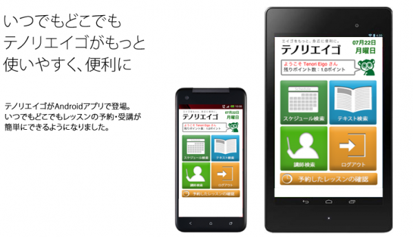オンライン英会話「テノリエイゴ」を運営する株式会社ビナヤマト(本社:東京都江東区、代表取締役社長:橋口有信、以下ビナヤマト)は、2013年8月29日よりオンライン英会話『テノリエイゴ』(http://tenorieigo.com)の公式Androidアプリをリリースいたしました。