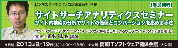ビジネスサーチテクノロジ株式会社は、「サイトサーチアナリティクスセミナー」を、2013年9月19日(木)に開催いたします。