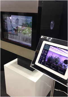 スマート植物工場の前面には、赤外線式タッチパネルと透明液晶を備えており、内部の植物を観察しながら、環境情報のチェックや栽培記録の入力が可能です。また、記録されたデータはクラウド上にも格納されるので、外出先ではWEBブラウザで状況を確認することができます。データの確認だけでなく、工場内の環境を制御することも可能です。