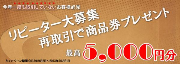 2012年12月末までに口座開設され、2013年1月4日以降お取引をお休みされているお客様を対象に、お支払いいただいた売買手数料500円ごとに500円分の商品券(上限5,000円)をプレゼントいたします。