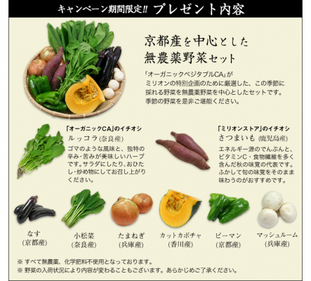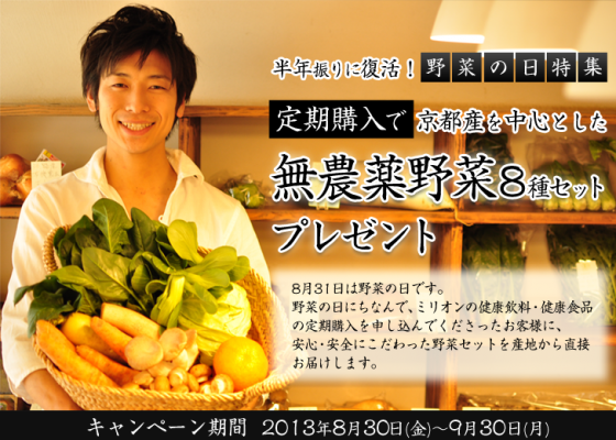 【内 容】 期間中にミリオン株式会社のECサイト「ミリオンストア」で健康飲料等の対象商品を定期購入で新規お申込みされた方全員に、京都産を中心にした“無農薬野菜8種セット” (提供:株式会社GAhttp://shop.ovca.jp/)をもれなくプレゼントします!
