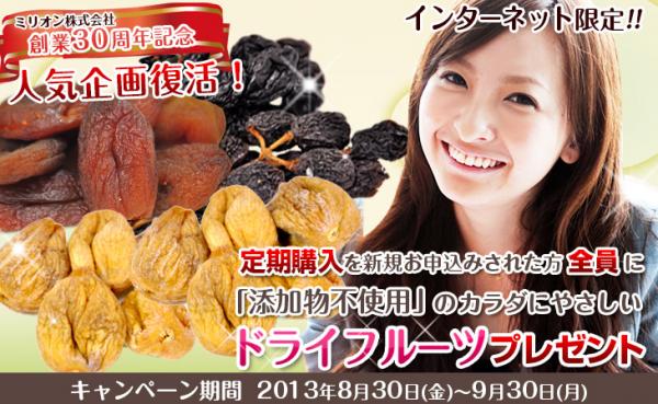 無臭ニンニク健康補助食品として27年のロングセラー商品「ミリオンパワー」、そして健康に配慮した「ミリオン健康飲料シリーズ」などを販売するミリオン株式会社(埼玉県さいたま市)は、8月30日~9月30日までの間にキャンペーン対象商品を「定期購入」で新規お申込みされた方全員に、“添加物不使用”のカラダにやさしいドライフルーツをプレゼントします。この機会に、ミリオンのお得な定期購入をご利用下さい。