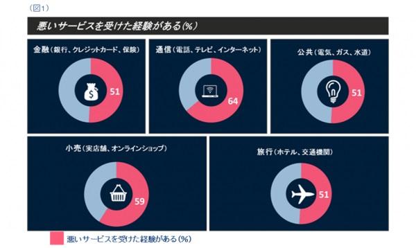 各分野の調査結果を見ると、「悪いサービスを受けた経験がある」と回答した対象者の割合は、金融サービス(51%)、公共サービス(51%)、ホテル/交通(51%)、小売(59%)、通信(64%) であった。一方、顧客サービスに対しては、金融サービス(61%)、公共サービス(51%)、ホテル/交通(64%)、小売(64%)、通信(54%)が満足していると回答した。悪い経験をした割合が59%の小売分野では64%がサービスに「満足」と回答、「不満」と回答した8%を大きく上回っている。