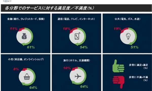 本調査で、悪いサービスを受けた経験があると回答した消費者は、調査対象国全体で高い割合を示した(図1)。しかし、このような経験があるにも関わらず、各分野で消費者の満足度は低くはない(図2)。