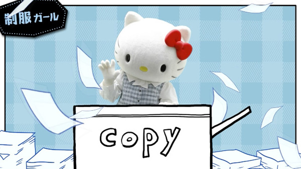 ハローキティがフォーク株式会社の事務服ブランド「nuovo(ヌーヴォ)」の事務服を着てOLとなり、制服の便利さや必要性を代弁するというコンセプトです。