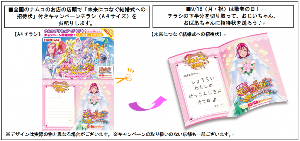キャンペーン開始に先駆けて、全国のナムコの店舗では、9月7日(土)より「未来につなぐ結婚式への招待状」付きチラシを配布いたします。チラシの下半分が招待状になっており、お子様自身がメッセージを書き込んで御祖父様、御祖母様に送ることができます。