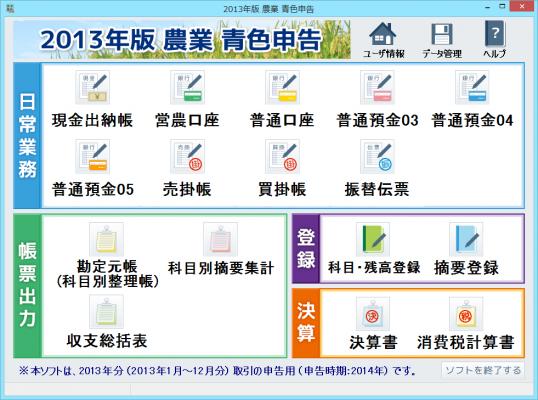 2013年度分対応の決算書・消費税計算書・税務署提出書類の最終入力及び出力を行えます。