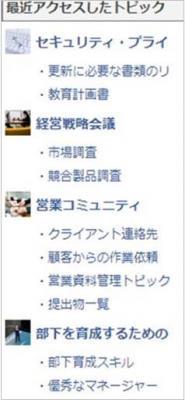 ユーザが直前にアクセスしたトピック履歴を表示します。作業途中に中断されても履歴の中から直前の作業ページに戻って、すぐにタスクを再開することができるようになります。