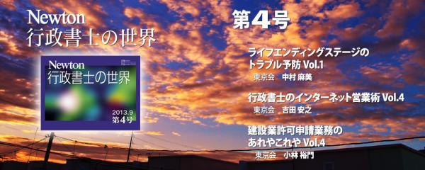 株式会社ニュートン(東京都渋谷区代々木2-1-1新宿マインズタワー20F 代表取締役高森圭介)は、2013年9月10日、月刊Newton「行政書士の世界」(IOS版)第4号を公開しました。幅広い行政書士業務の広報・普及活動による行政書士業務の拡大を目的としています。(URL)http://gyousei-world.newton-jp.com/(お問い合わせ先)03-5352-7760(株)ニュートン支配人大久保宏明 <okubo@newton-net.co.jp>