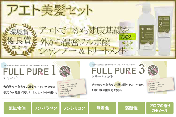 フルピュアシリーズは、体にやさしい、無鉱物油、ノンパラペン、ノンシリコン、無着色、弱酸性のシャンプーとトリートメントで、アロマの香りカモミールで癒します。
