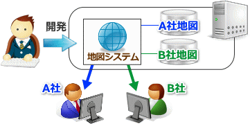 それぞれが持つ個別情報や背景地図を切り替えて運用でき、複数サーバーを保持する維持管理費の削減や
