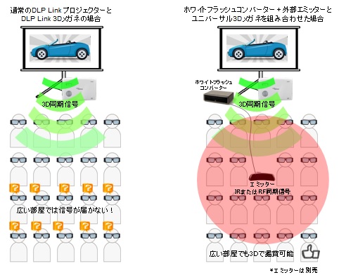 ユニバーサル・ビジネス・テクノロジー(本社:東京都千代田区)は、DLP Link プロジェクターの3D同期信号をIRまたはRF信号に変換し、外付けIR/RFエミッターをつかうことで教室・ホールなど広い施設内でもDLP Link プロジェクターの3D鑑賞を可能にする、XPANDホワイトフラッシュコンバーターの発売を9月20日より開始いたします。