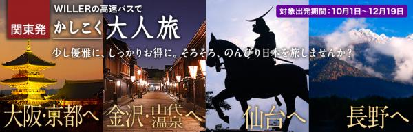 移動ポータルサイトを運営するWILLER TRAVEL株式会社(http://travel.willer.co.jp、代表取締役:村瀬 茂高、以下ウィラートラベル)は、大人向けの旅行プラン『高速バスで行く かしこく大人旅』をウィラートラベルサイトにて販売を開始しました。10月1日~12月19日出発を対象に、関東発の高速バス「WILLER EXPRESS」とホテルのセットプランを特別価格で販売します。