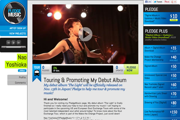 Pledge Music (http://www.pledgemusic.com/) はアメリカで発足した音楽に特化した日本未上陸のクラウドファンディングサービスで、これまでにBen Folds FiveやSlashなども利用しています。Nao Yoshiokaはこのサービスを利用し、$10,000の資金援助達成を目指します。