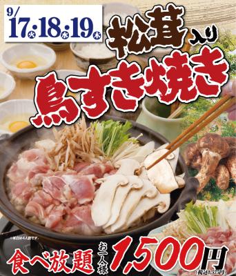 ◇イベント内容:きのことの相性バツグンの「鳥すき焼き」に秋の味覚の王様「まつたけ」を加えて食べ放題でご奉仕