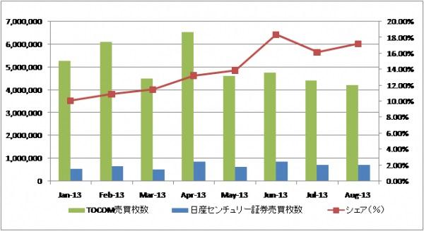 このたび、日産センチュリー証券(所在地:東京都中央区 代表取締役社長:二家英彰)では、東京商品取引所(以下、TOCOM)における平成25年8月の当社の売買枚数が726,052枚、同月の月間総売買枚数シェアが17.23%となりました。