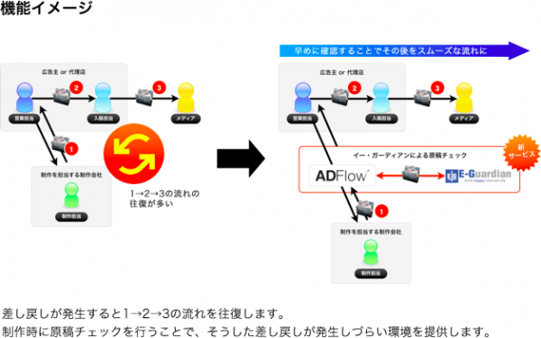 今回、イー・ガーディアンとの共同開発により提供するサービスは、上述のADFlow上でランディングページに記載された画像や文言内容のチェックサービスです。国内大手メディアレップ、メディアを中心に入稿管理業務のアウトソーシングを数多く手がけてきたイー・ガーディアンのスキル・ノウハウをバックボーンに、誇大表現や景品表示法に触れる不当表示、健康食品や医薬品などであれば薬事法との照合といった、専門家でないと判断が難しい表現のチェックまで対象とします。