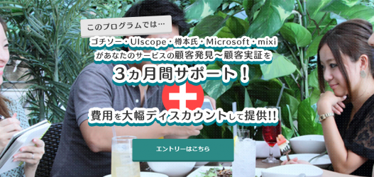 当プロジェクトはWebサービスを開発するスタートアップが、ターゲットとなるユーザーの本質的なニーズを“サービスリリース前”に正しく理解し、彼らが本当に必要とするサービスの創出を支援します。「入門編」として2013年9月4日に行った、ユーザーインタビューの基礎を学び実際のスタートアップ立ち上げや商品開発につなげるためのワークショップイベントでは、40名の企業の担当者の方々にお集まり頂きました。今回の「実践編」では、参画企業を2~3社限定で募集し、開発しているWebサービスの顧客発見・顧客実証をMVP(※消費者ニーズを満たすかどうかを判断するために必要な機能のみ含めた実用最小限のサービス)の開発とユーザーインタビュー・ユーザビリティテストを通して実施して頂きます。また、参画企業にはスポンサー企業による各種サービスの特別提供や「入門編」で講師を務めたUXリサーチャ/ユーザビリティエンジニアである、利用品質ラボ代表の樽本徹也氏による隔週でのフォローをさせて頂きます。