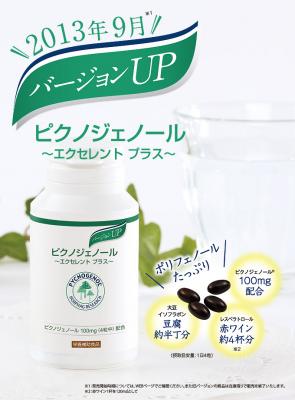 バージョンアップでは、ピクノジェノールRの含有量はそのまま、新たに「大豆イソフラボン」「レスベレトロール」「パインセラミド」を追加しました。