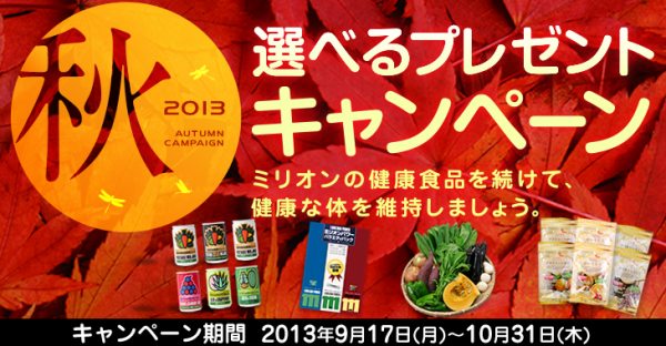 無臭ニンニク健康補助食品として27年のロングセラー商品「ミリオンパワー」、そして健康に配慮した「ミリオン健康飲料シリーズ」などを販売するミリオン株式会社(埼玉県さいたま市)は、9月17日~10月31日までの間にキャンペーン対象商品を「定期購入」で新規お申込みされた方を対象に、4つのプレゼントからお選びいただく、「秋の選べるプレゼントキャンペーン」を実施します。この機会に、ミリオンのお得な定期購入をご利用下さい。