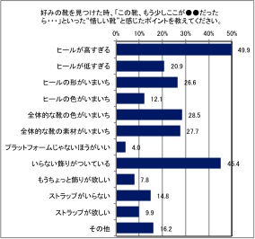 ブラケットで女性593名に靴に関するアンケート調査を実施したところ、“惜しい靴”のポイントとして約半数の女性が回答したのが「いらない飾りがついている」というもの。一方で「もうちょっと飾りが欲しい」と回答した女性は約8%にとどまり、靴に対してシンプルさを求めている女性も多くいらっしゃることが分かりました。