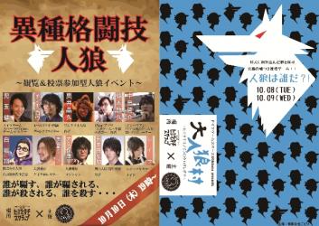 10/10(木)は、新しいイベント『異種格闘技人狼』。人狼業界関係者、愛好者による人狼ゲームを観戦&投票できる参加型人狼イベントとなっている。