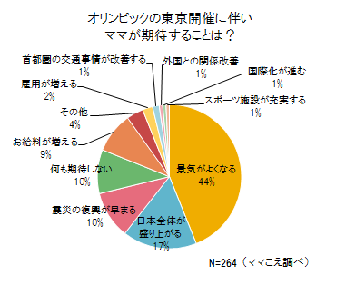 「オリンピックの東京開催に伴い、ママが期待することは?」(n=264)と聞いたところ、「景気がよくなる」と答えたママが全体の半分になり、次点の「日本全体が盛り上がる」と合わせると61%に達しました。まずは日本が明るいムードになることを望むママが多数のようです。また、「震災の復興が早まる」ことに期待するママが1割を占めていました。