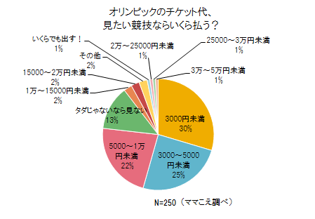 では、東京オリンピックの会場に実際に行くなら、ママたちの財布のヒモは緩むのでしょうか。ママに「オリンピックのチケット代、見たい競技ならいくら払う?」(n=250)と聞いたところ、「3,000円未満」(30%)、「3,000~5,000円未満」(25%)、「5,000~1万円未満」(22%)となりました。