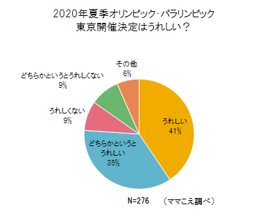 「2020年夏季オリンピック・パラリンピック東京開催決定はうれしい?」(n=276)という質問に対し、「うれしい」「どちらかというとうれしい」と答えたママが76%で大多数を占めました。