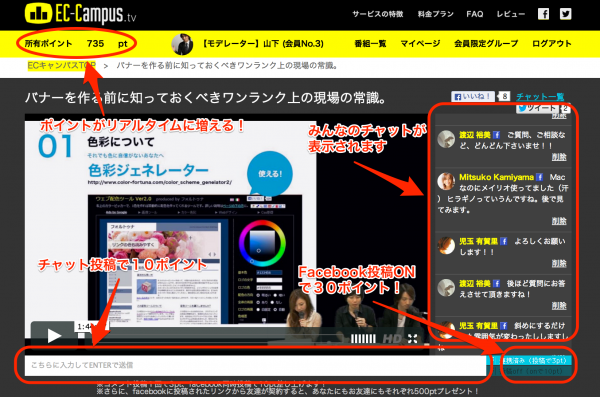 ユーザーは、配信時にチャット投稿をすると、1投稿につき10ポイント(これまでは3ポイント)を。また、Facebook同時投稿で30ポイント(これまでは10ポイント)が即時付与されます。このポイントを付与されたユーザーは、番組をより楽しいものにすることができるだけでなく、月額会員の契約時に1ポイントを1円として支払いに充当することができ、他のEラーニングコースを無料で受講をすることが可能になります。