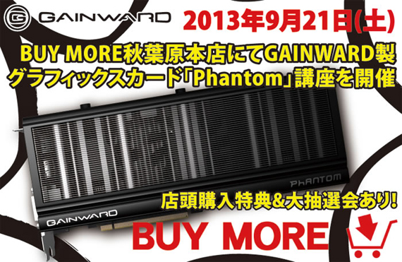 Gainward製グラフィックスカード「Phantom」講座は、2013年9月14日より発売を開始したGainward製グラフィックスカードの解説イベントです。9月21日(土)秋葉原のBUY MORE秋葉原本店にて開催いたします。特徴的なPhantomシリーズの解説、高い冷却性能と静音性、最適なGainward製グラフィックスカードのご提案をいたします。また、9月21日(土)BUY MORE秋葉原本店にてGainward製グラフィックスカードをご購入頂いたお客様には、人気のゲーミングタイトルをおひとつプレゼントいたします。さらに、Intel製CPUやゲーミングデバイスなどがあたる豪華な大抽選会を実施いたします。