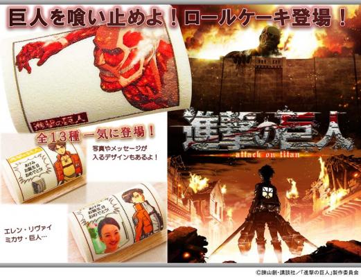 TVアニメ「進撃の巨人」のロールケーキが登場しました。「プリロール」を運営する株式会社栄通(本社:東京都八王子市)は、「進撃の巨人」(諫山創原作で別冊少年マガジン(講談社刊)に連載中)のイラストをプリントしたロールケーキを2013年9月24日(火)に発売致しました。エレン・ミカサ・リヴァイ・超大型巨人のデザインや、お好きなメッセージやお手持ちの写真をロールケーキにプリントできるデザインなど合計13種、誕生日にもぴったりのロールケーキです。