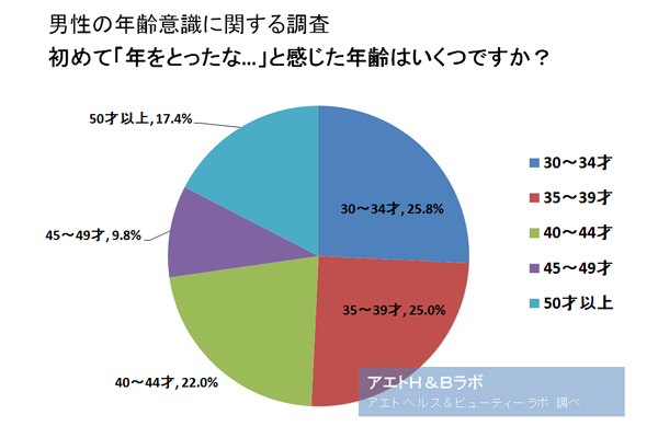 前回の女性の年齢意識に関する調査レポートでは約半数が30代前半に集中しましたので、男性のほうが「年をとった」と感じるのが遅い傾向にあります。