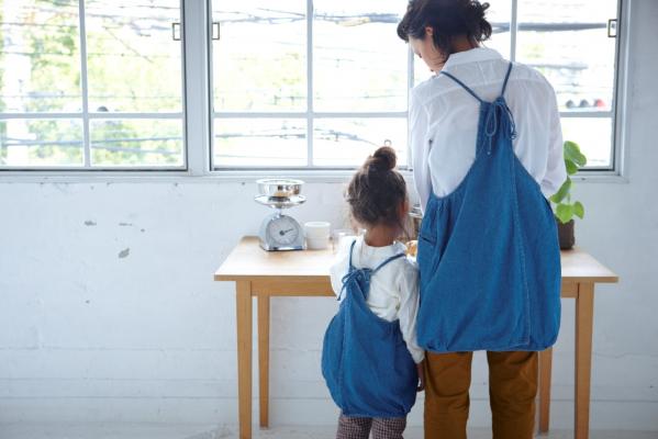 バルーンエプロンは名の通りバルーンシルエットをつくり出すかわいらしいデザインが人気のエプロンで、親子ペアで着られること、エプロンとは思えないデザイン性の高さでコーディネートも楽しめることなどが好評を博し、発売以来、人気商品となっております。