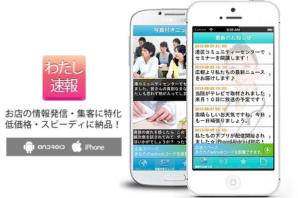 スマートフォンアプリの低価格開発を手がけるフィフティーフォー・クリエイティブ(代表:米倉 豪志)は、店舗や企業の最新ニュースを顧客に簡単迅速に配信するためのスマートフォンアプリ(iOS、Android対応)を、初期費用無料、月額15,400円~、最短5日間で制作するサービス【わたし速報】( http://watashisokuhou.com )を、9/25(水)に正式公開します。