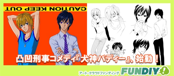 本プロジェクトは、主に出版社のコミック雑誌で執筆されてきた漫画家 麻見雅氏が、「一度は雑誌編集部の方向性にとらわれず、自分が描きたい作品をそのまま描きたい、形にしたい」という強い思いから、『FUNDIY』スタートプロジェクトの一つとして立ち上げたものです。プロジェクト成立を受けて、これまで同氏の脳内に留めてあったNew麻見ワールド“イケメン2人が繰り広げるデコボコ刑事コメディー『犬神バディー』”が遂に始動します。なお、完成作品については、マンガ配信サービスである『まんが王国』にて2013年12月から配信を開始する予定です。