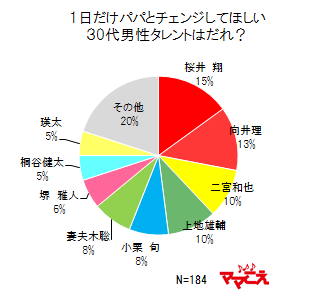 「1日だけパパとチェンジしてほしい30代男性タレントはだれ?」(n=184)と聞いたところ、1位が櫻井翔さん(15%)、2位が向井理さん(13%)という結果となりました。櫻井さんに対しては勉強を教えること、向井さんに対しては料理を作ってくれることを期待しているママが多数で、「ママがパパにお願いしたいこと」がうかがえる結果になりました。