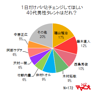 「1日だけパパとチェンジしてほしい30代男性タレントはだれ?」(n=172)と聞いたところ、1位が福山雅治さん(17%)、2位が藤木直人さん(12%)、3位は西島秀俊さん(10%)となり、既婚・未婚とはあまり関係なく、大人の魅力がある男性が上位にノミネートされる結果となりました。“良いパパ”という観点からは、4位の木村拓哉さん(9%)が上位に挙げられていました。