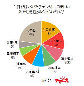「1日だけパパとチェンジしてほしい20代男性タレントはだれ?」(n=172)という質問に対し、1位に生田斗真さん(16%)、2位に山下智久さん(13%)が登場し、ジャニーズ人気が見られる結果となりました。また、3位に福士蒼汰さん(10%)、4位に松坂桃李さん(9%)、8位に佐藤健さん(5%)と、仮面ライダー・戦隊ヒーローで活躍したタレントが多数登場しました。