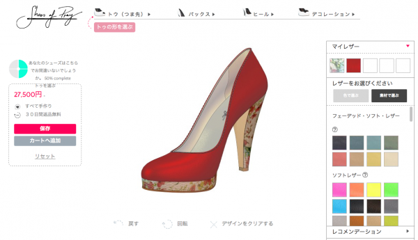 『Shoes of Prey (シューズ・オブ・プレイ)』は、2009年の冬にシドニーにてスタートした、まったく新しい感覚の「靴のショッピング」サイトです。インターネット上で、自由自在に靴をデザインしオーダーをすると、世界でたった一つのオリジナルシューズがご自宅に届きます。ヒールの高さ、素材、色、形、デコレーションも、自由自在に変えることができ、3兆通り以上の異なる靴のデザインをすることが可能です。