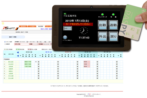 自社開発のAndroidタブレットにICカードや携帯電話を使って、簡単に勤怠管理を行う事ができます。