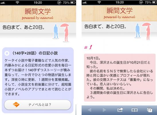 『瞬間文学』はナノベル作家が書き下ろした140文字で積み重ねる短編小説を「瞬間日記」で約1ヶ月間に渡り日々提供、それを前後半にまとめた小説はナノベルアプリ上で読むことができます。今回は8月に実施し、好評を博した「瞬間文学Season1~同窓会で会いましょう~」に次ぐ第2弾。ケータイ小説や電子書籍などで人気の作家、内藤みかによる27歳OLの片思いの日々を日記形式で綴る物語。