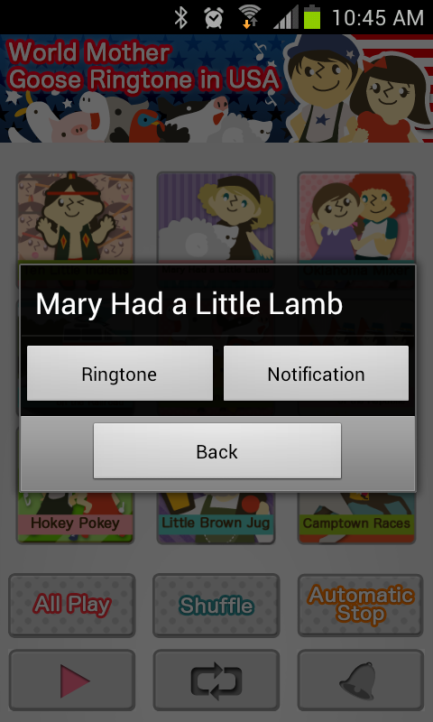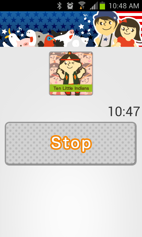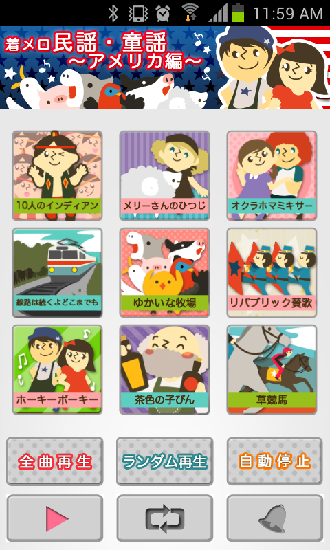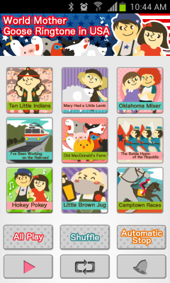 「着メロ民謡・童謡~アメリカ編~」は、Android端末にて親子のふれあいにピッタリの童謡定番曲を再生できるアプリケーションです。今回はシリーズ弟6弾となり、海外の育児の場面でもご使用頂けるよう英語対応しました。幼稚園や保育園、親子で一緒に楽しく歌える定番の童謡を、高音質の着メロで収録しています。かわいい絵をタッチするだけで簡単再生。