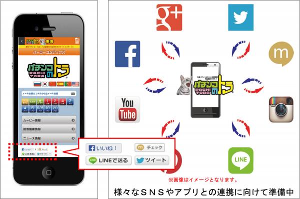 1)『パチンコのトラ』スマートフォン版の各ページに「LINE、Facebook、Twitter、mixi」ボタンの設置
