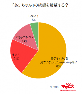 9月28日に最終回を迎えたドラマ「あまちゃん」。過去10年のNHK朝の連ドラでは、平均視聴率は2位(関東地区で20.6%)、最高視聴率(27.0%)は1位という好結果のこの人気ドラマ、ママたちに「『あまちゃん』の続編を希望する?」(n=206)と聞いてみたところ、60%が「見ていなかったからわからない」と回答。「見たかったけれど見られなかった」という意見も多く、子育て世代のママのライフスタイルだと、朝の連続ドラマの時間帯にTVを見ることが難しいことが読み取れます。