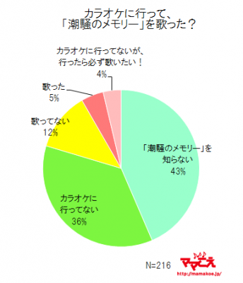 「カラオケに行って、『潮騒のメモリー』を歌った?」(n=216)と聞いたところ、歌う以前に「『潮騒のメモリー』を知らない」という回答が4割以上という結果になりました。一方、「歌った」(5%)、「カラオケに行ってないが、行ったら必ず歌いたい」(4%)という層も1割見られました。