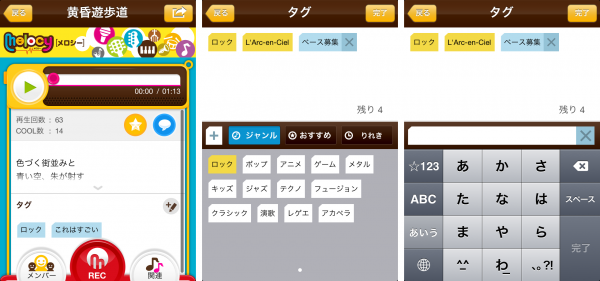 (画像左から、再生画面、選択形式タグ編集画面、自由入力タグ編集画面)
