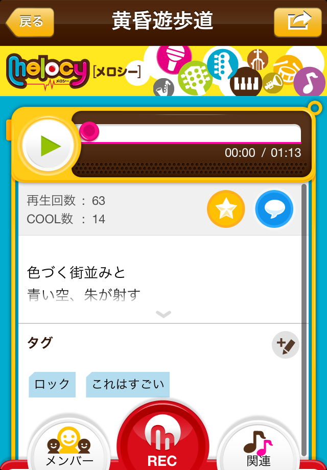 melocyでは、iPhoneアプリで録音した演奏に、他のユーザーが演奏を重ねて録音できます。例えば最初のユーザーがドラムを公開し、別のユーザーがベース、ギター、ボーカルなどを重ねることで、楽曲を完成させます。